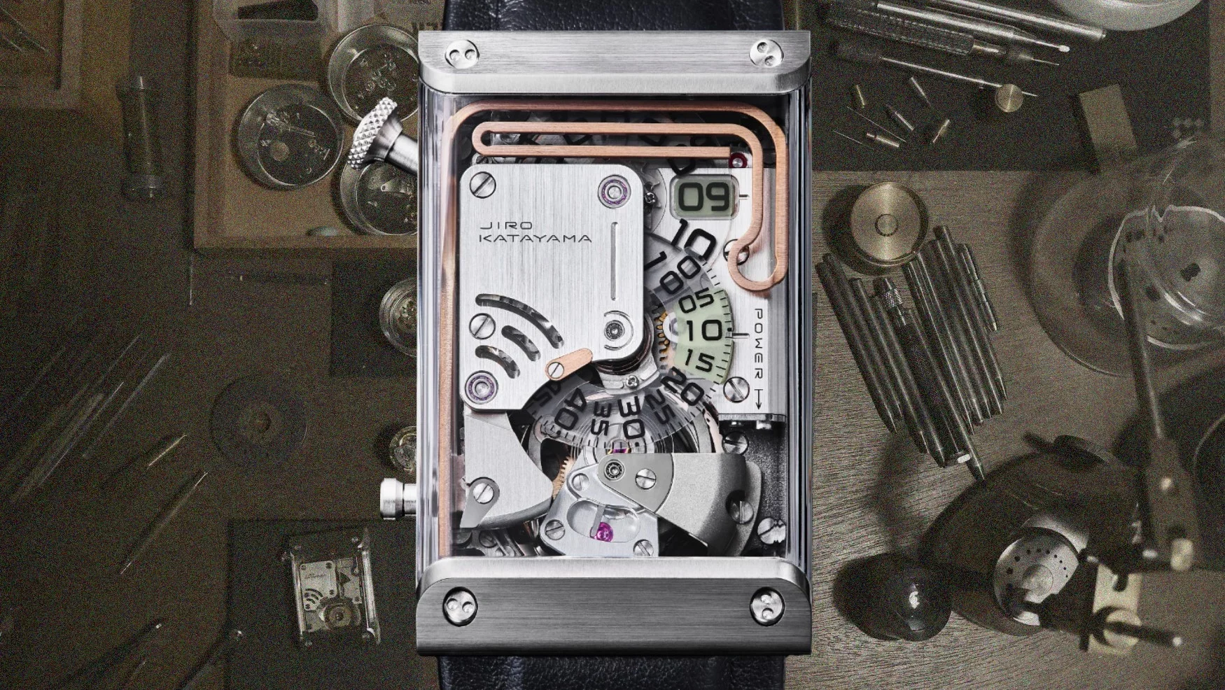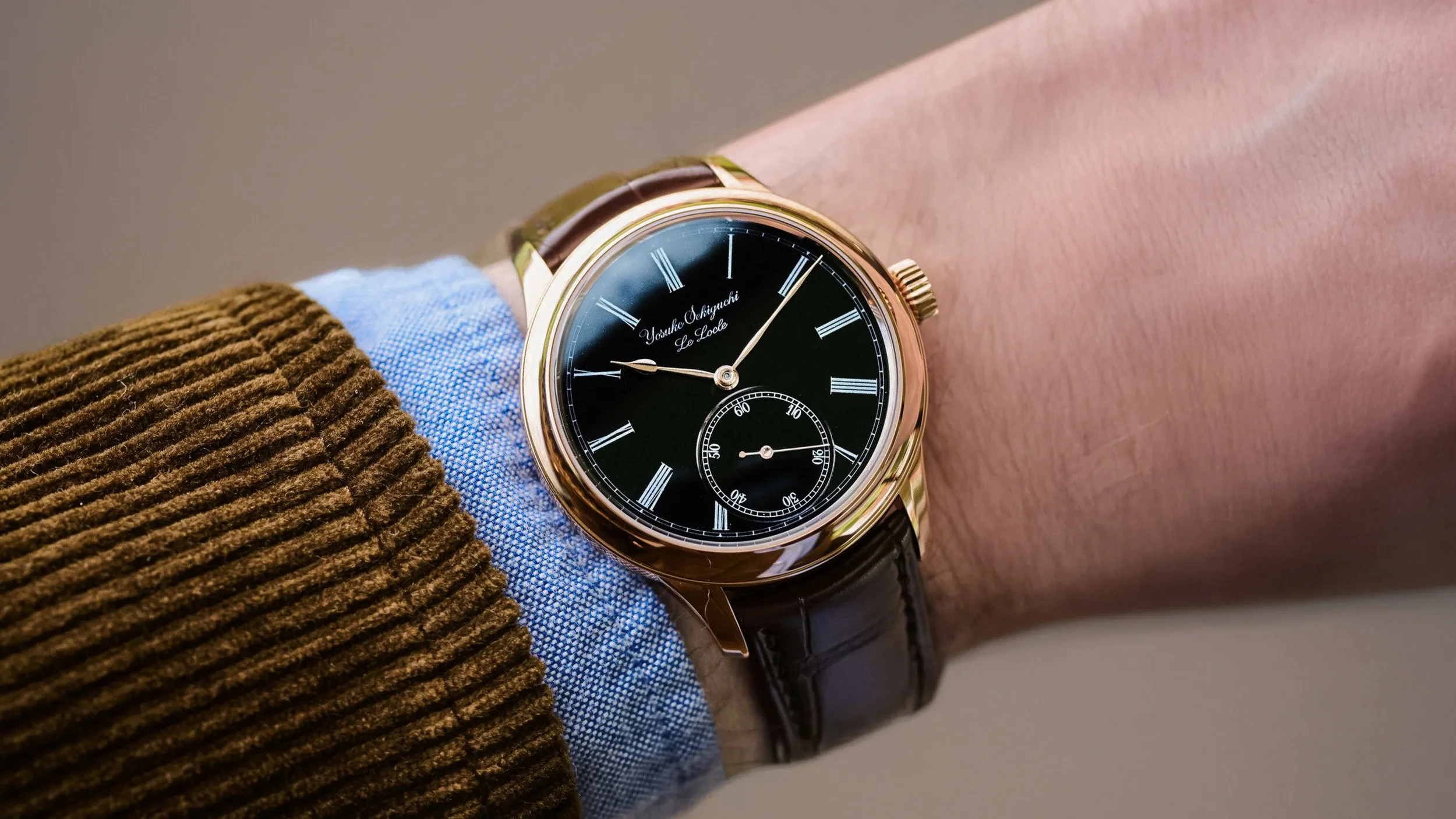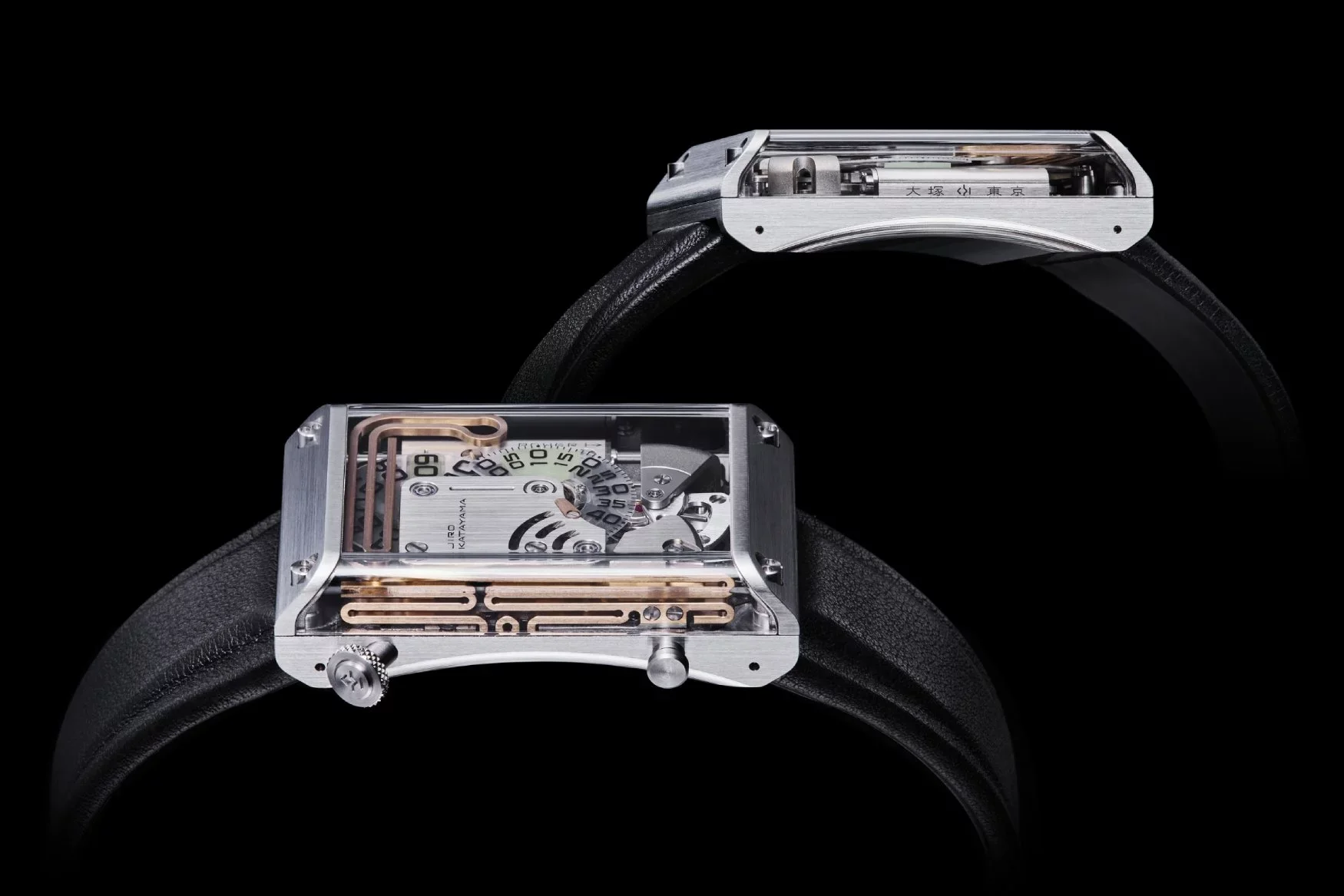 La version personnelle de Masahiro Kikuno, qu’on pourrait qualifier “de poche”. Il s’agit d’un inrō, un petit boitier traditionnel utilisé à l’époque Edo pour transporter médicaments, sceaux, herbes et petits objets à sa ceinture (et non pas dans la manche du kimono comme je le disais). Le tout est maintenu par un petit contre-poids appelé netsuke (ici le petit personnage en bois). Crédit Watches by SJX